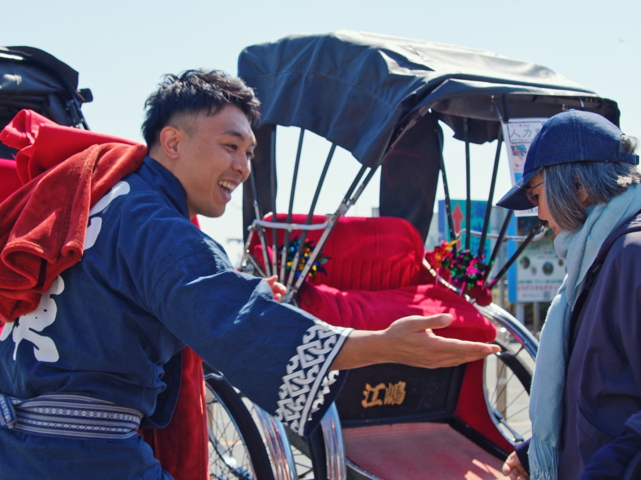 - 鎌倉や浅草で10年以上の観光人力車キャリアを持ち、 江ノ島エリアで育ち、江ノ島藤沢ガイドクラブにも 所属している地元俥夫によるご案内!
