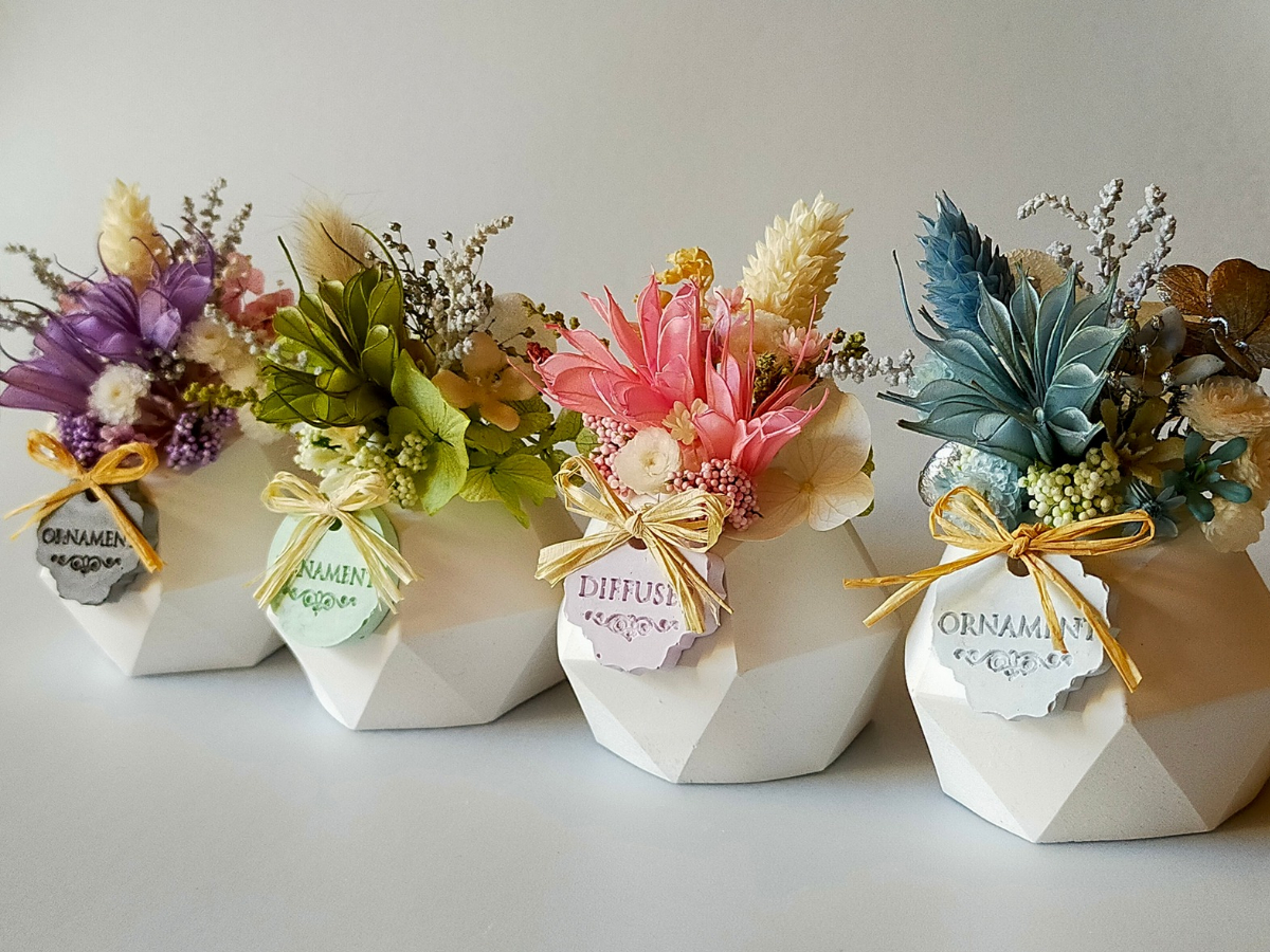 - アロマストーンのポットにドライフラワーやアーティシャルフラワーで飾り付け お好きな香りとお花で素敵な空間を演出します。 華やかなアロマストーンは贈り物にも喜ばれます。
