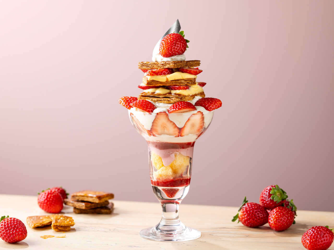 - 多彩な表情の苺を一度に味わえる贅沢パフェが登場。 頂上には苺のミルフィーユ、食べ進めていくと生クリームや苺ムース、苺ゼリーが顔を出します。