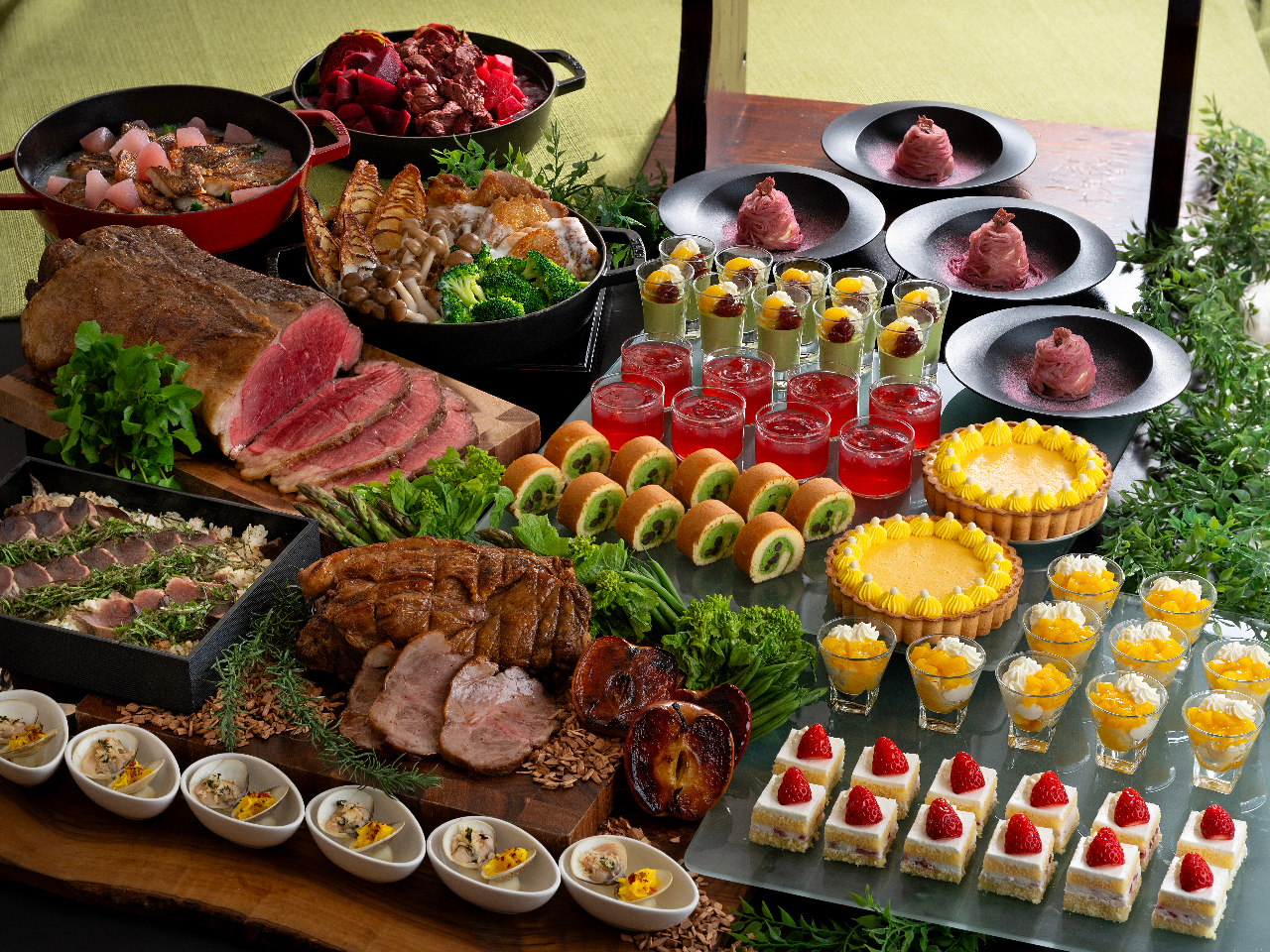 - メインディッシュは、お肉&お魚Wメイン@「ツインプレート」伝統のA「ローストビーフ」鉄板で焼き上げるB「ステーキ」から選べる一皿とサラダ、パン、デリカ、スイーツがお好きなだけ召し上がれるセミブッフェ