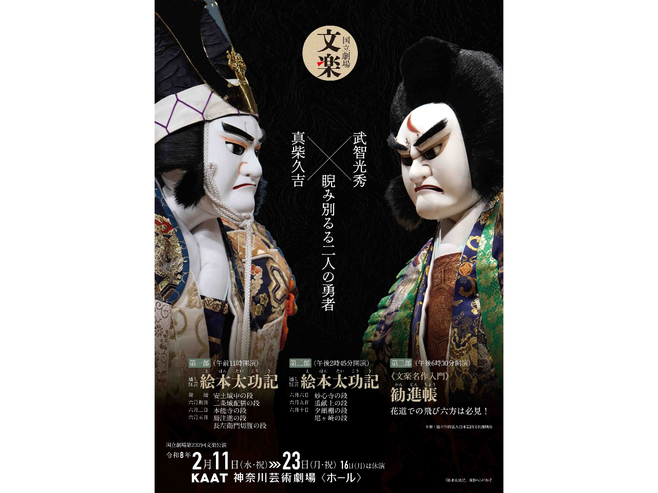 - 文楽の演目の中でも特に著名な『絵本太功記』を、約二十年ぶりの上演となる場面を含め、通し狂言として上演!日本大通り駅徒歩5分とアクセス良好なKAAT神奈川芸術劇場で開催!