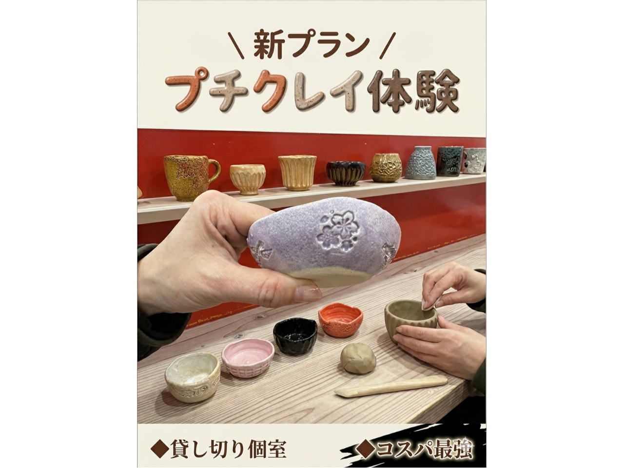 - ★地域最安値!最短30分の体験で当日や予定のついでにサクッと本格陶芸! ★世界にひとつのオリジナルを形に!人目を気にせず無心になれる贅沢時間。 ★貸切個室で家族やお友達同士でワイワイねんどで制作