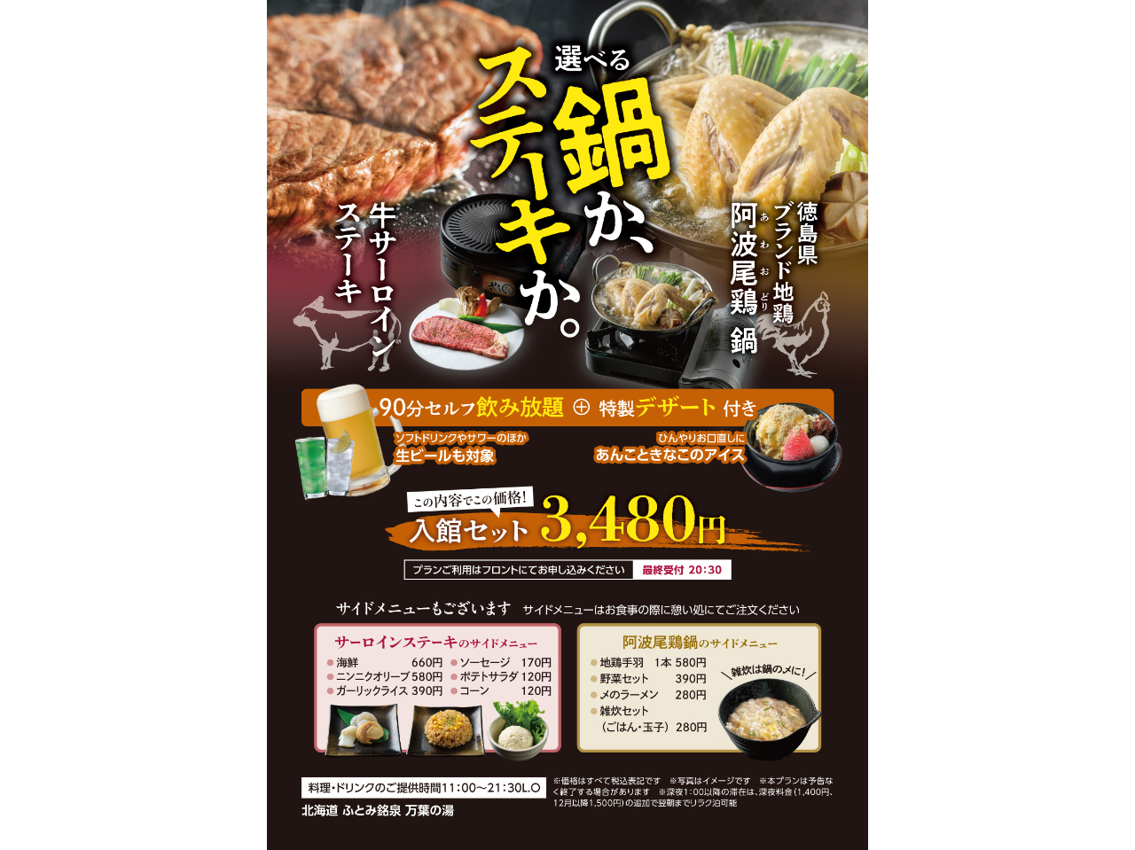 - ☆【ブランド地鶏鍋】または【牛サーロインステーキ】&温泉を満喫♪+飲み放題90分+特製デザート付ご入館セットプラン☆ 鍋かステーキ選択!お得なサイドメニューもご用意!!