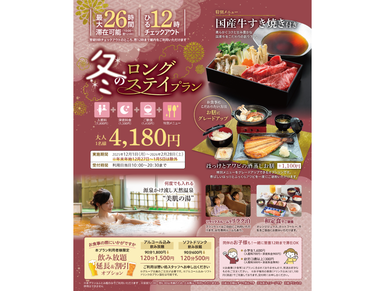 - 【冬のロングステイプラン】入館料+深夜料金+ご朝食+特別メニュー