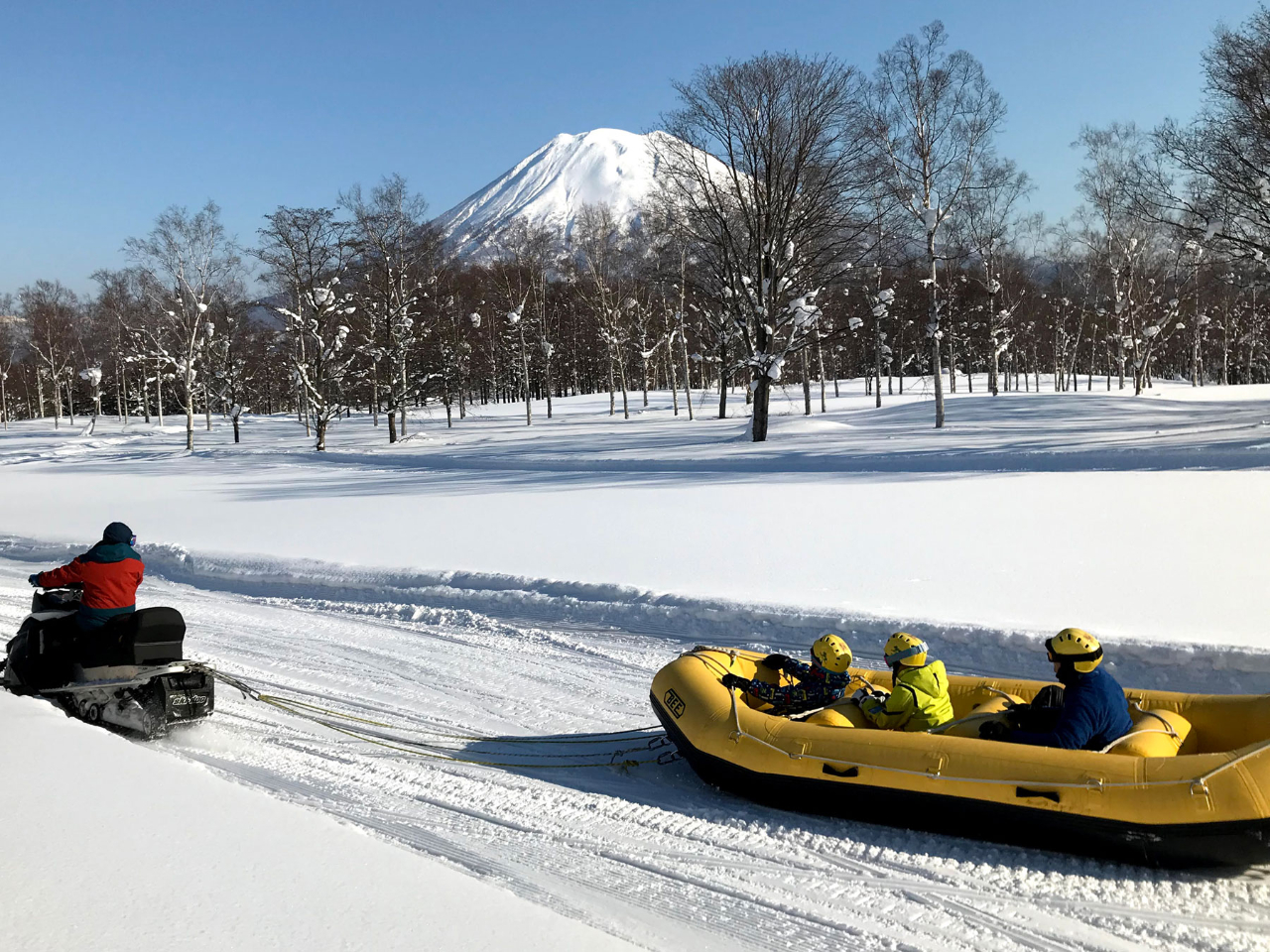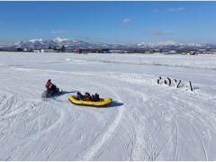 - ラフティング用のゴムボートをモービルで引っ張ります!雪の大地を疾走するスリリングな体験を!