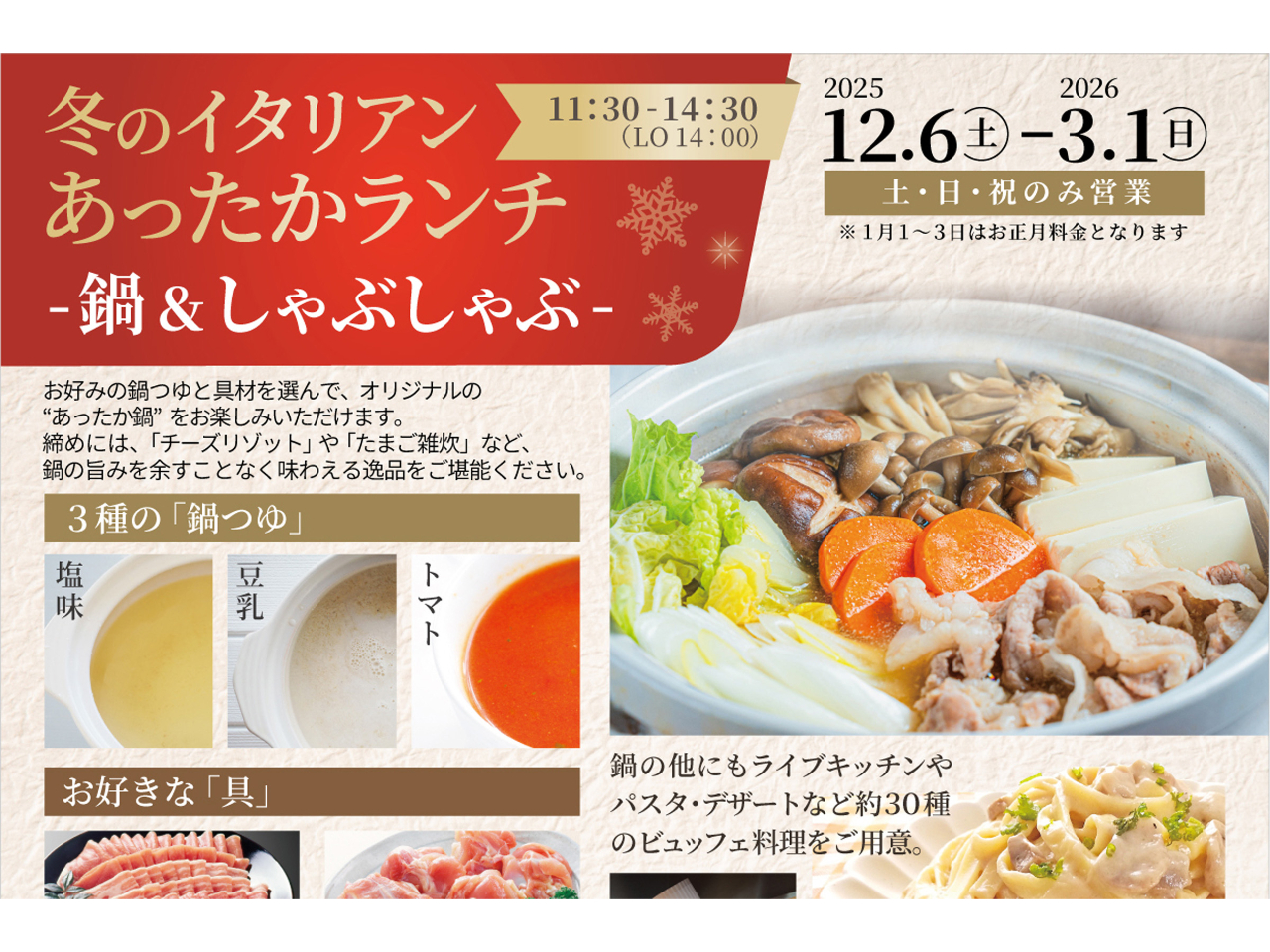 【土日祝】12月6日〜3月1日!冬のイタリアンあったかランチ 【鍋&しゃぶしゃぶ】