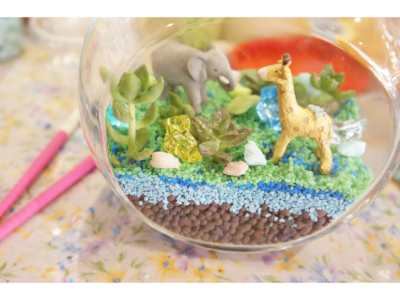- 透明なガラス容器にお好みの植物や小物を入れて小さな世界を作ります。 管理の簡単な多肉植物を使うので、水やりも少なくて済み、室内で観賞することができます。