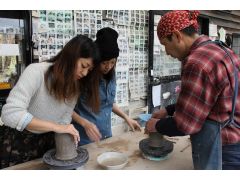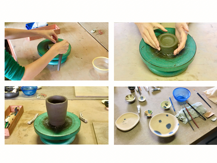 制作体験は、手びねりと絵付け、上絵付け、上級の4つ。手動ろくろに捏ねた粘土をのせてクルクルとろくろを回しながら形に仕上げていく『手びねりコース』は、形にしたら釉薬を塗って...