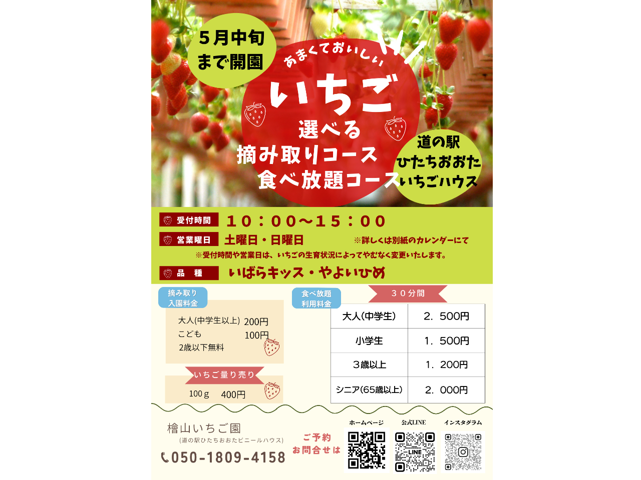 - 家族みんなで楽しめる、いちごの楽園へようこそ! いちごハウスでは、「摘み取り・量り売り」と「30分食べ放題」の2つのプランをご用意。人数や予算にあわせてお好きなプランをお選びいただけます。