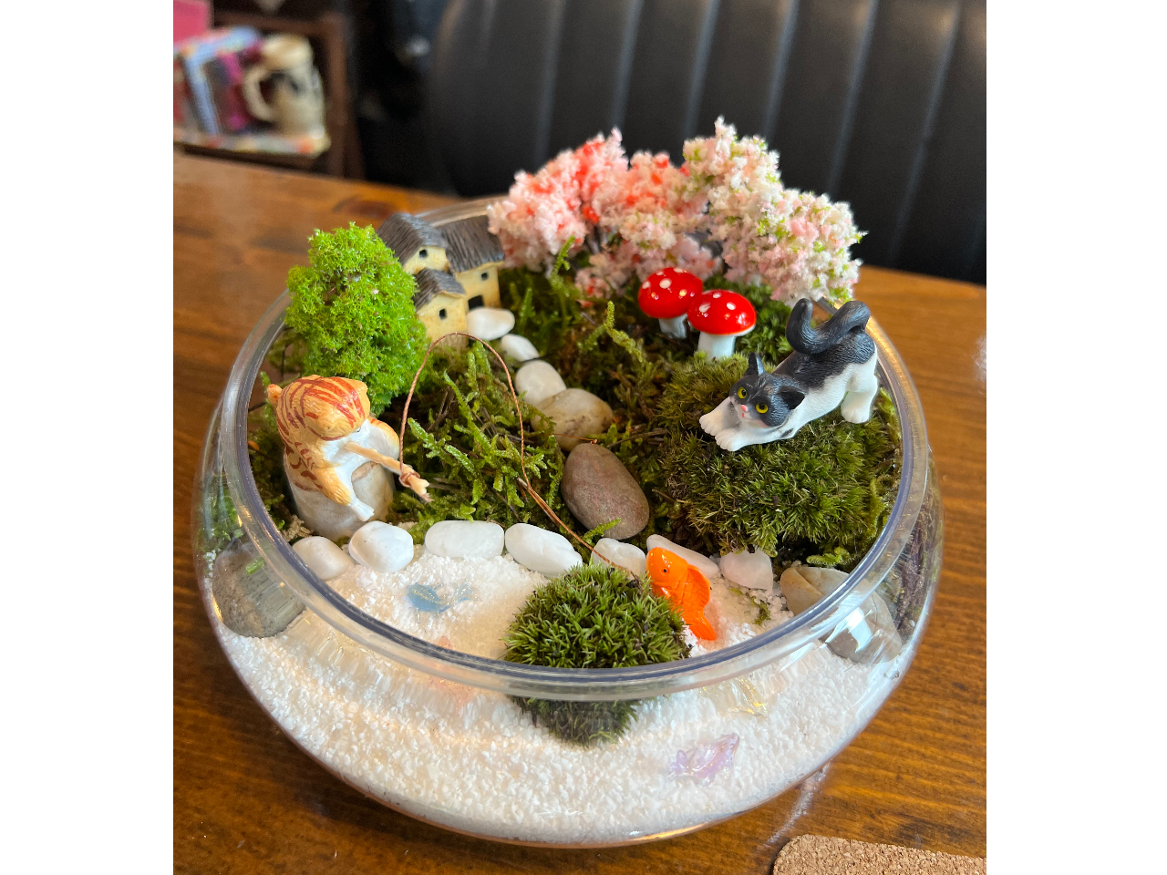 - お好きな器とその時ご用意してある沢山の動物や家のフィギュア、木のジオラマなどを選んでいただき、本物の苔との融合で、オリジナルな世界が作れます☆