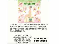 - アットホームな雰囲気の中で日々の疲れを癒やしませんか? よもぎ蒸し以外にもメニューも豊富です。 お子様連れでも大丈夫ですので安心してご来店ください。