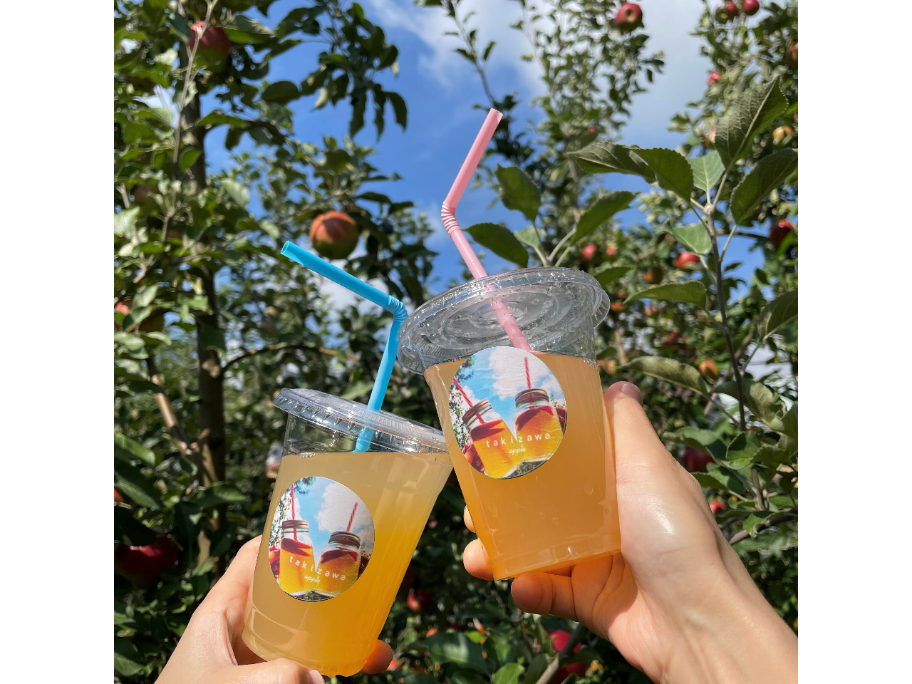 - 定番のりんご狩りに100%りんごジュースが付いたプラン。その場で飲んでもお持ち帰りでもOK!