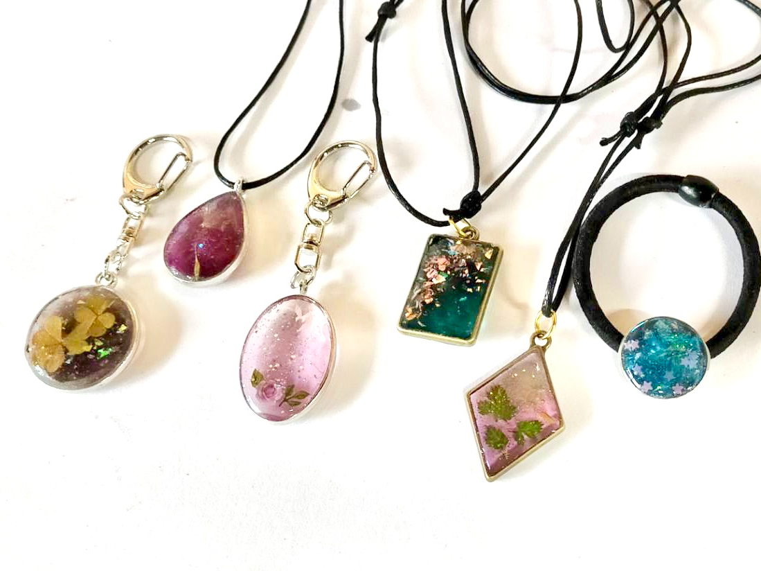 - ●レジンでキーホルダーやネックレス、ヘアゴムなどが作れます!(材料費込み・当日お持ち帰りOK!) ●初めての方大歓迎!お子様(小学生〜)とご一緒の体験にもぴったりです♪