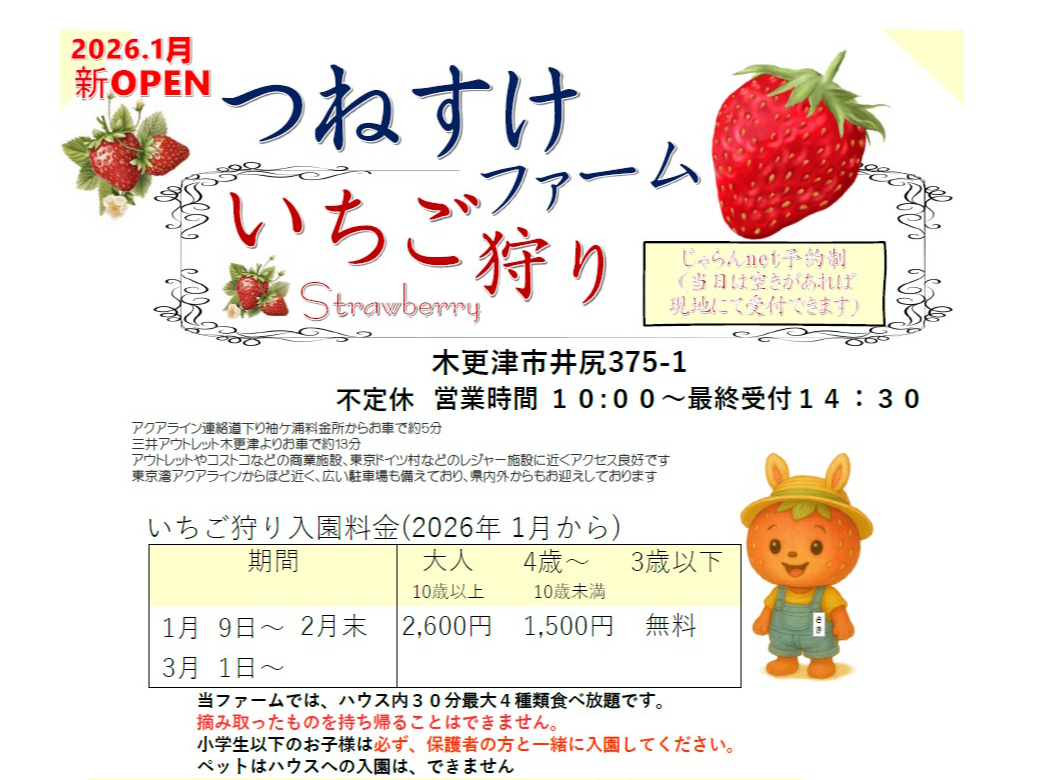 - ★2024年度じゃらん関東エリア優勝★ ★千葉県の玄関口アクアラインから1番近い大型いちご農園♪ ★きれいな水栓トイレを完備(多目的トイレあり)駐車場80台(バスもOK)