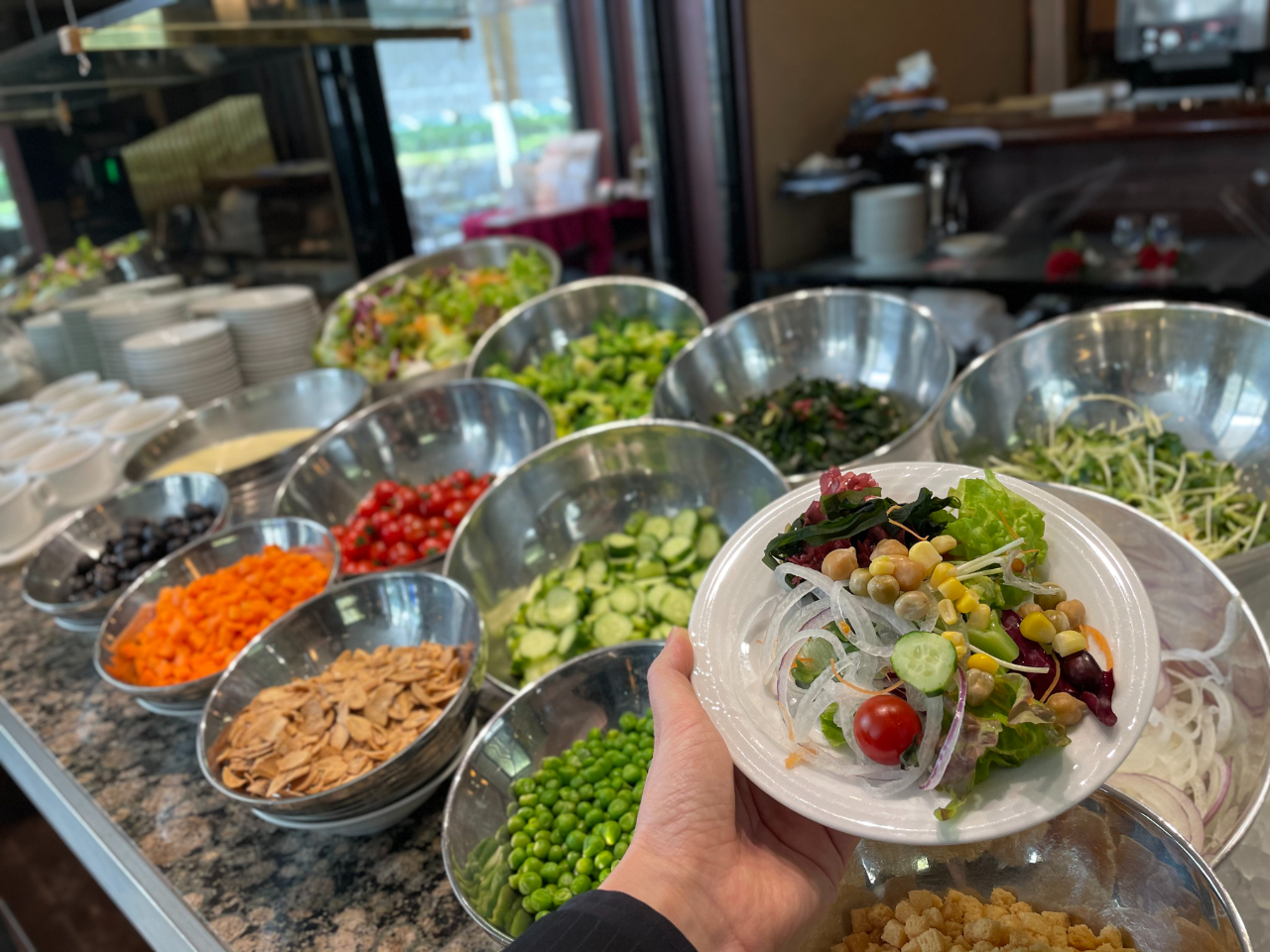 - 羽田空港と多摩川を望む絶景で、スパゲッティをメインに、川崎市のもりもり卵を使用した温度卵のほか、地元の新鮮野菜を楽しめるベジタブルコーナーや、スープ・デザートがお好きなだけ堪能できるハーフブッフェ。