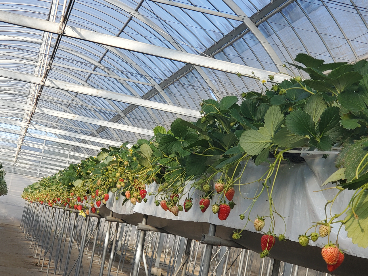 温室内なので雨を気にせずにいちご狩りを楽しむことができます。 大人と子ども、車イスの人でも余裕を持ってすれちがえる通路幅(1.2m)を獲得、そして通 路の段差を極力減らし、バ...