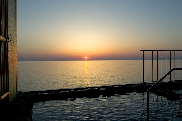 - 当館は日本海沿岸に位置していて、露天風呂に入ると眼前には水平線が広がります。 昼は青い海と空、夕方は真っ赤な夕日、夜は満天の星空と漁火。 時間帯によって変化していくさまざまな絶景をお楽しみください。