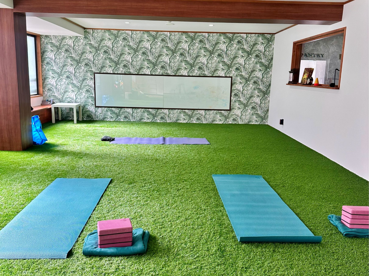 - 富士山麓・河口湖の澄んだ朝の空気の中、人工芝が敷かれた室内スタジオでの “朝のフロー” ヨガ体験。