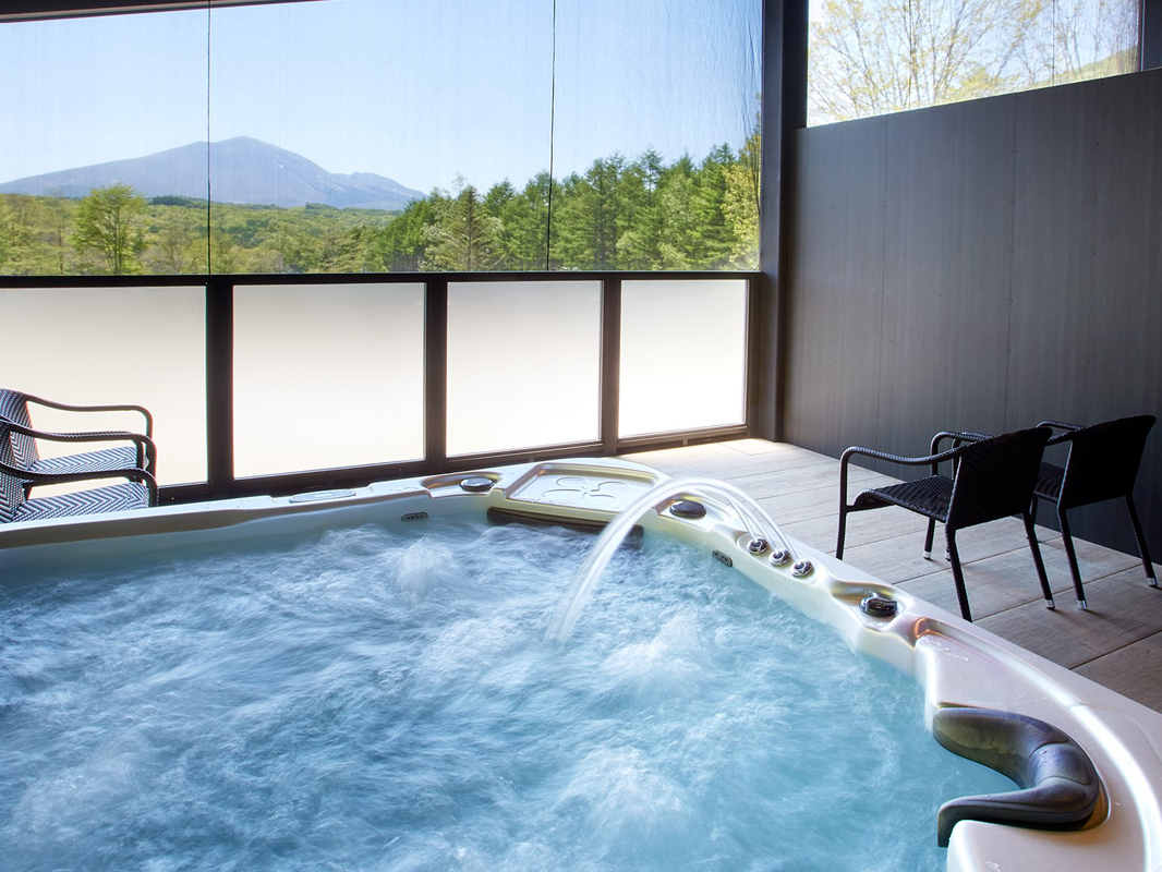 - 絶景の浅間山を望む大浴場には、木漏れ日が気持ちいい露天風呂のジェットバス、 天然檜の香るドライサウナ、水風呂を完備しております。