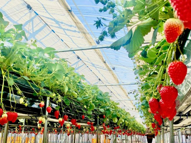 国内最大級の大型温室で、広さはテニスコート70面分。天井高さも8mという広々した大空間でいちご狩りをお楽しみいただけます。上下に動く吊り下げ式の栽培棚、床は全面コンクリート張...