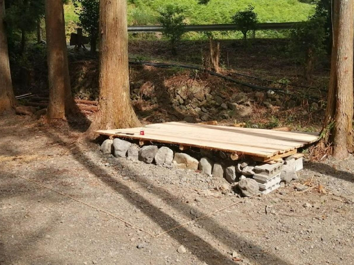 - □アウトドアDIYで仕上げた手作りキャンプ場 □キャンプ場の真ん中を流れるすがり川と両岸の巨大岩達が、様々な丸太造作物や周囲の木々と調和し、癒しの空間を織りなしています。
