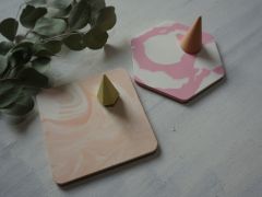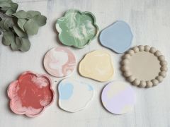 - ジェスモナイトを使ったマットでかわいいコースター・リングスタンドを作ろう! お好きなカラーでマーブル模様や単色に色付け可能です。