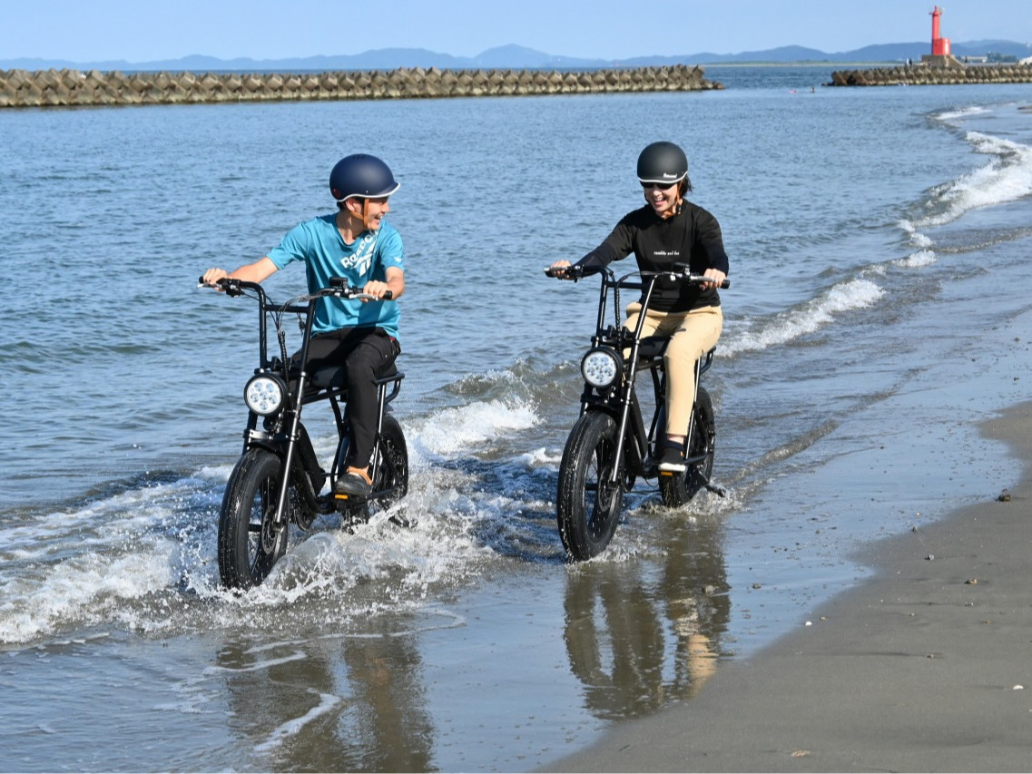 - 全国でも珍しい、砂浜や田んぼのあぜ道などどこでも走れる電動のレンタルファットバイク! オートバイのようなシルエットで、町ですれ違う人が振り向くほどインパクト抜群な自転車です!最大7時間利用可能!