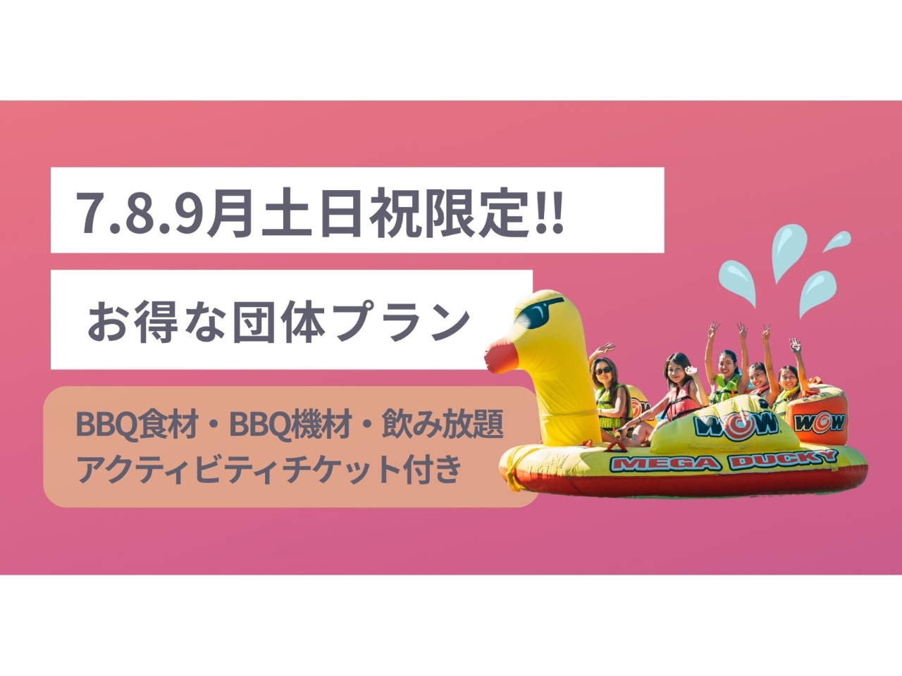 - 平日限定の超お得プラン!! 施設利用料・BBQ機材・BBQ食材・飲み放題2H付・アクティビティチケット1枚付き! 通常15,000円程かかるところが、10,000円!