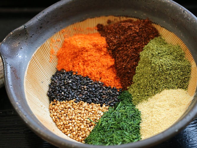 - オリジナルブレンドで京七味を作れます。とうがらし、山椒、青のり、陳皮、胡麻(白ごま、黒ごま)、ケシの実、麻の実を使用。好みの配合が出来たら出汁に入れて味見。辛さの加減や、風味を調整してビンに詰めます。