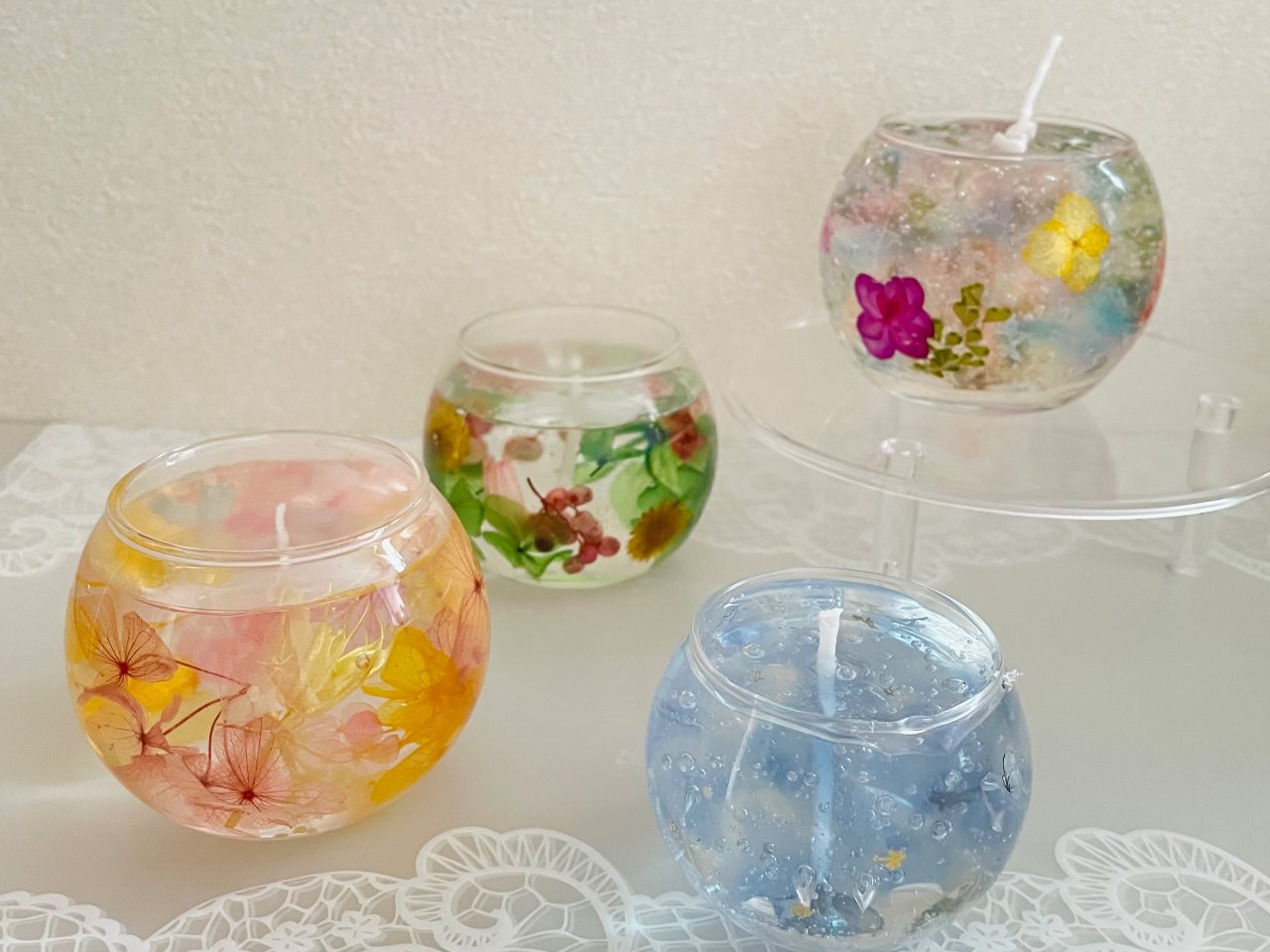 - ぷくぷく泡が入っているような透明のジェルキャンドル 透明のワックスで作るので、飾っても、火を灯しても輝いてきれいです