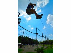 地上7mの高さに張り巡らされたアスレチックコースに『命綱』『安全ベルト』『ヘルメット』を装着してチャレンジするドキドキ・ワクワクの冒険施設! 高さへの緊張、勇気を出してク...