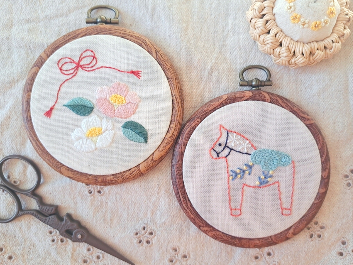 - ・刺繍作家アミュのオリジナル図案を刺繍! ・季節にそった図案をご用意♪この季節は「椿の花」や「ダーナラホース」がオススメ♪ ・基本から丁寧にお教えするので初心者さんも安心♪お気に入りの刺繍小物が完成♪