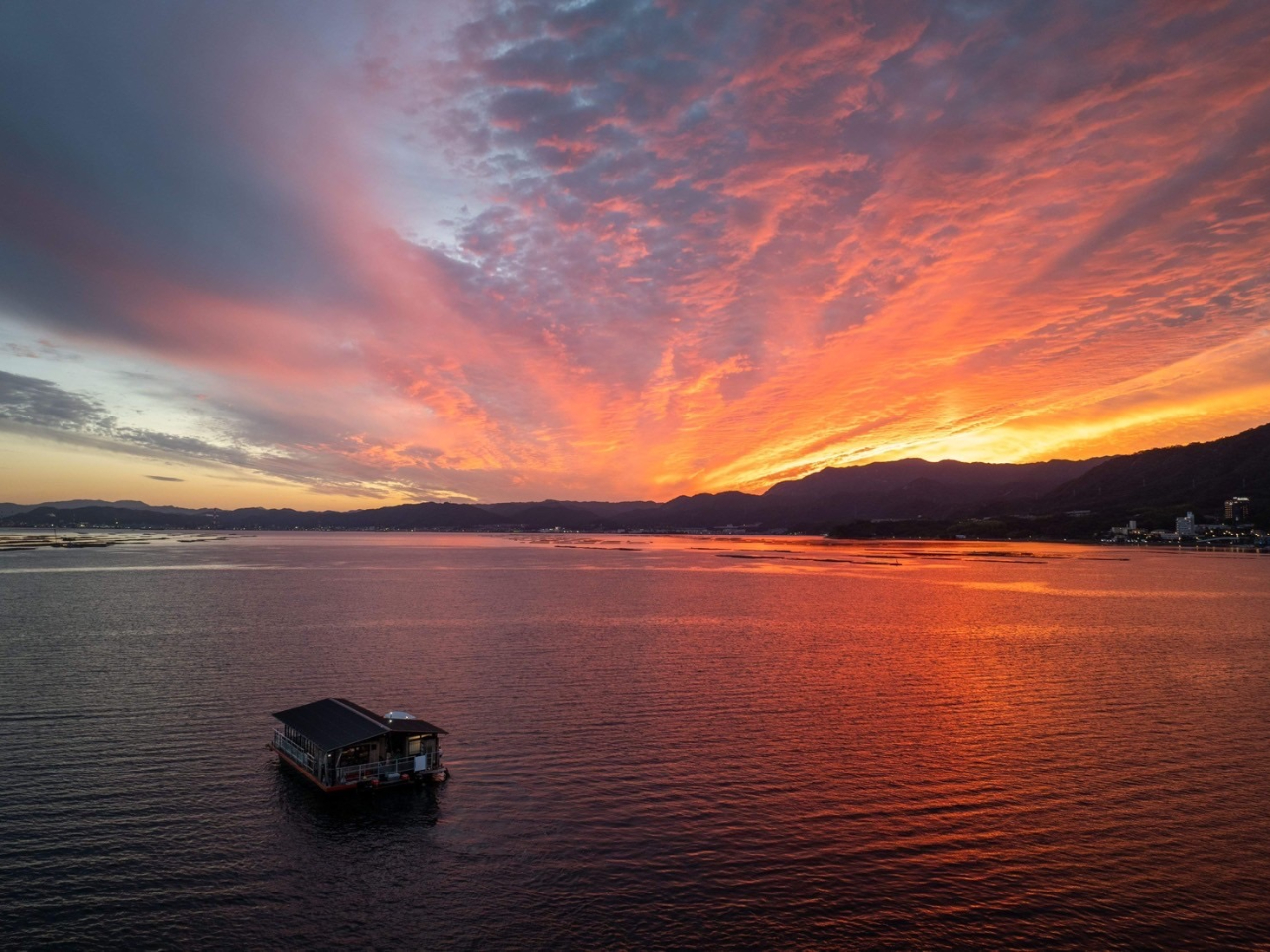 - 「多島美を染める茜色の瀬戸内」 第三勇盛丸は元々瀬戸内の底引き網漁船。瀬戸内ならではの景色を瀬戸内ならではの船に乗って倉橋の海賊王と非現実の世界へ。倉橋島でしか見れない乗れない船で広島県最南端の夕日を