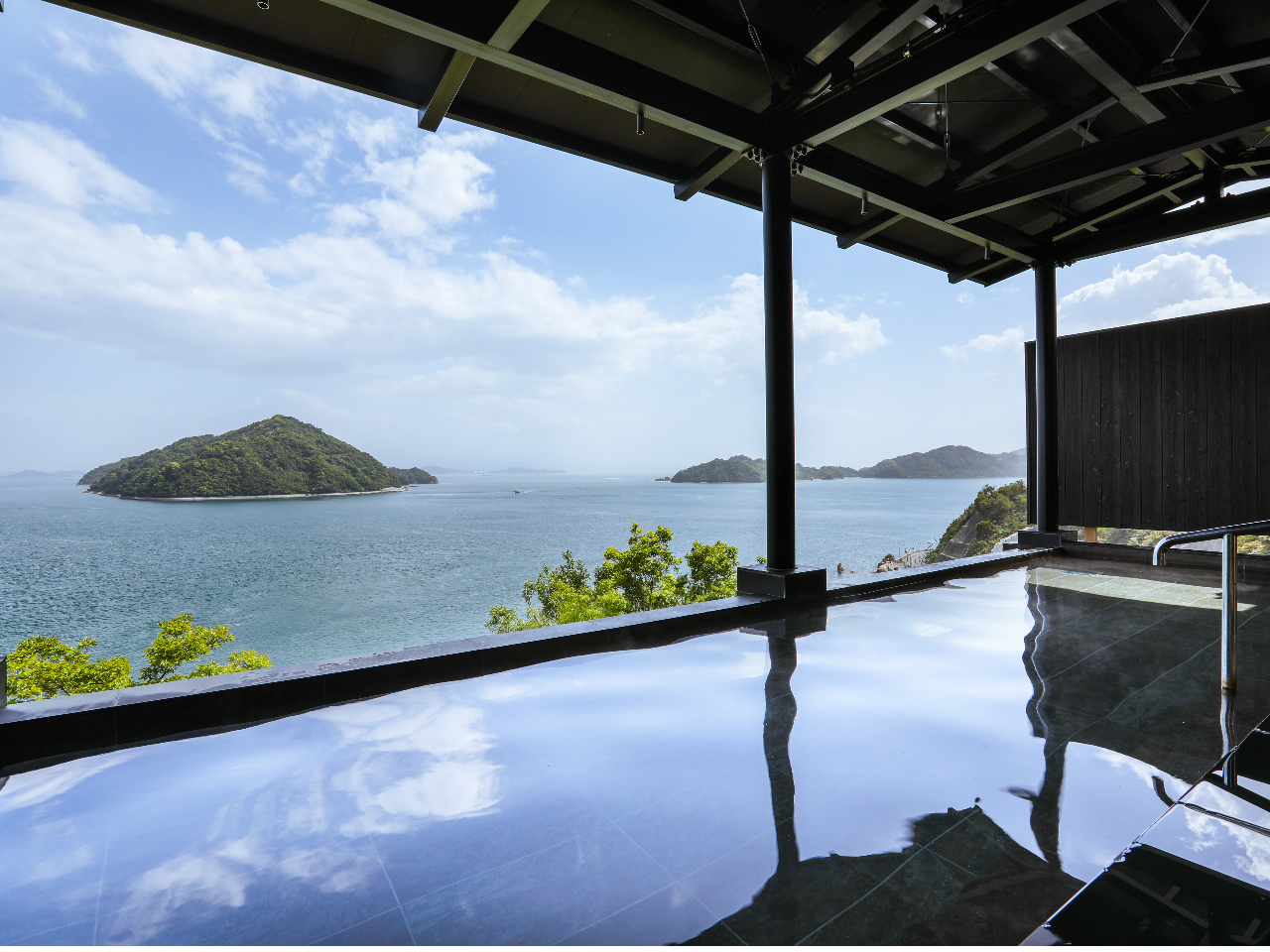 - 安芸グランドホテルの新名所、絶景露天風呂 プライベートで上質な空間。絶景を眺めながらのくつろぎ時間。 静かな癒やしのひとときをご堪能ください。