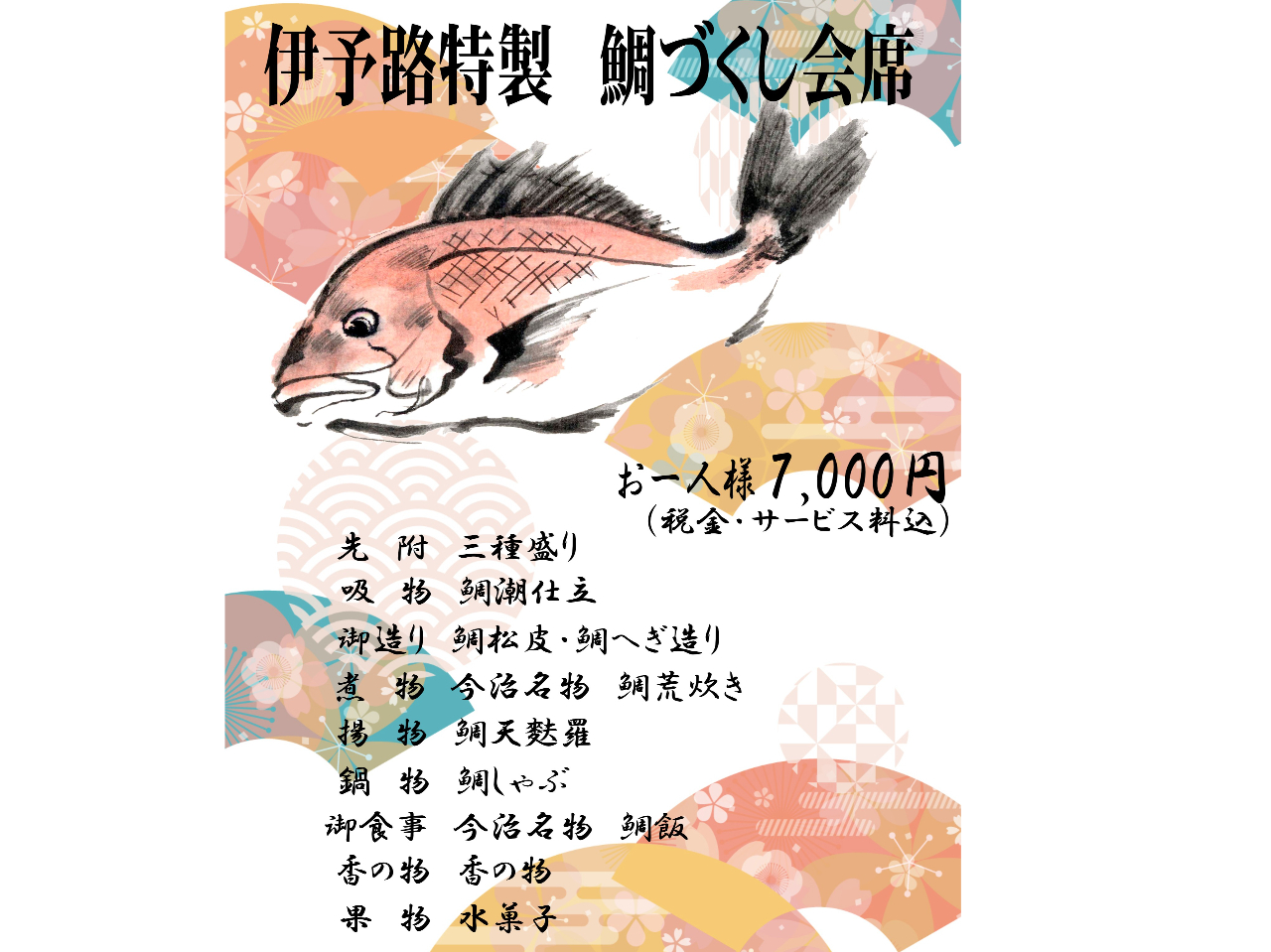 - 最初から最後まで鯛会席 ワンドリンク付き(生ビール・日本酒・焼酎・ソフトドリンク)