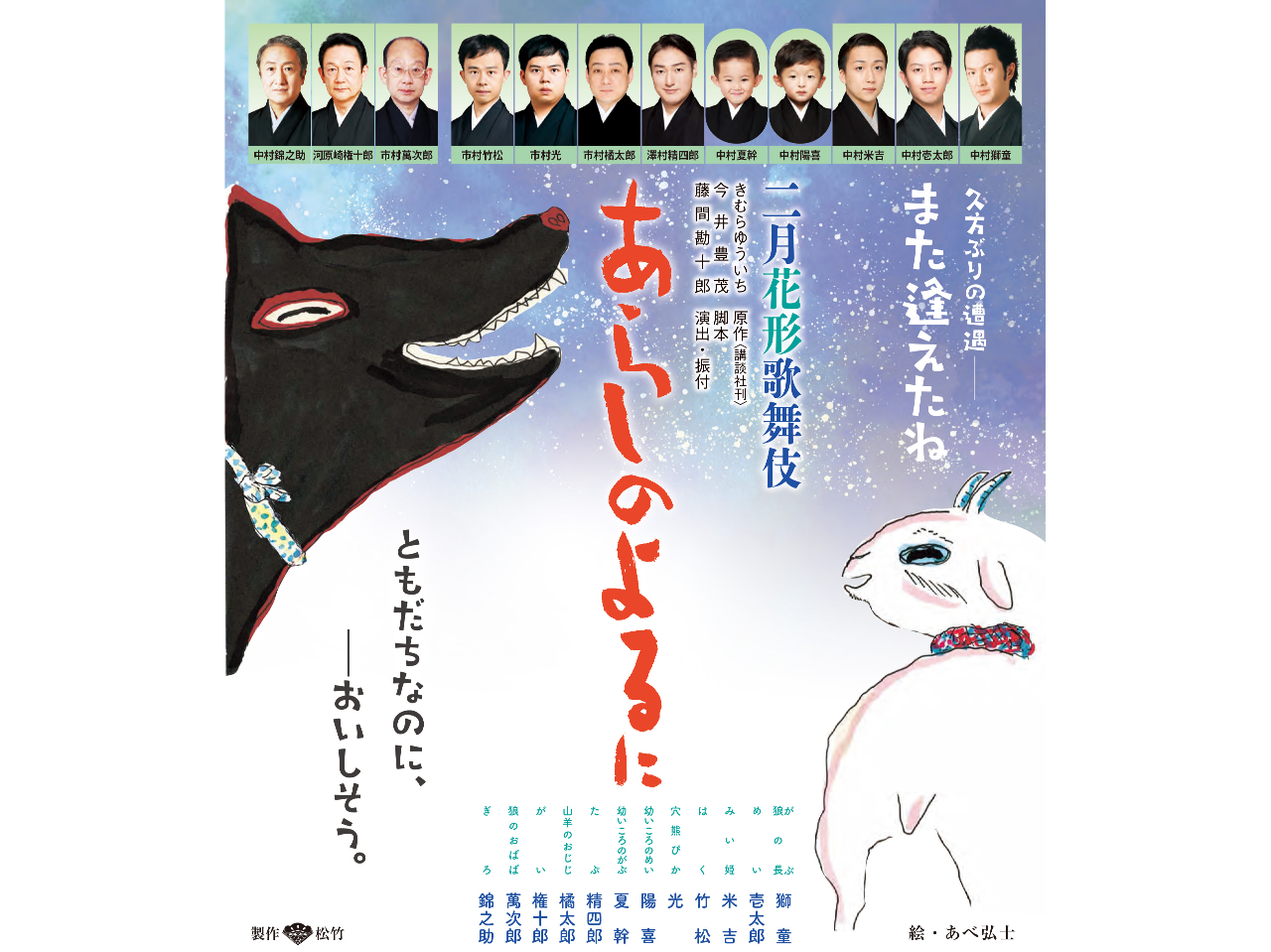 - \大ベストセラー絵本「あらしのよるに」を原作とした歌舞伎/ ・原作の世界観をそのままに、古典歌舞伎の演出や技法を巧みに用いた舞台 ・この度博多座で、約8年ぶりの上演! ※本公演は3歳以上の方が対象です