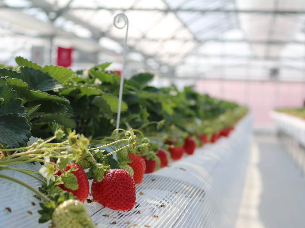 ★若者が中心となって盛り上げる、株式会社Cクリエイトが運営する『スカイフローラファーム』では福岡県内のいちご生産事業者で、初めて導入した「ハンギングガター」を採用していち...