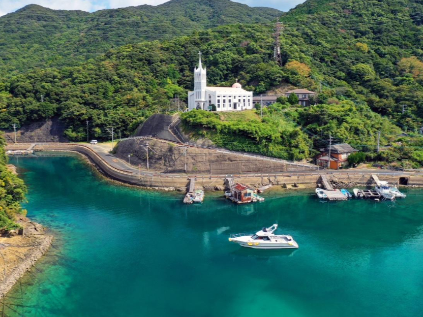 中通島の南端、若松瀬戸を眼下にする教会。禁教の時代に弾圧を受けながらも信仰を続けた信者が1800年代に建てたもので信仰の自由を手に入れたことを喜ぶかのように屋根の色は目立...