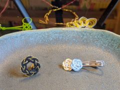 - メンズ水引:スーツのアイテムのピンズとネクタイピンの二種類を選んで貰います ピンズは輪っか結び、ネクタイピンは梅結び、男性でも水引に挑戦! 男性へのプレゼントに!