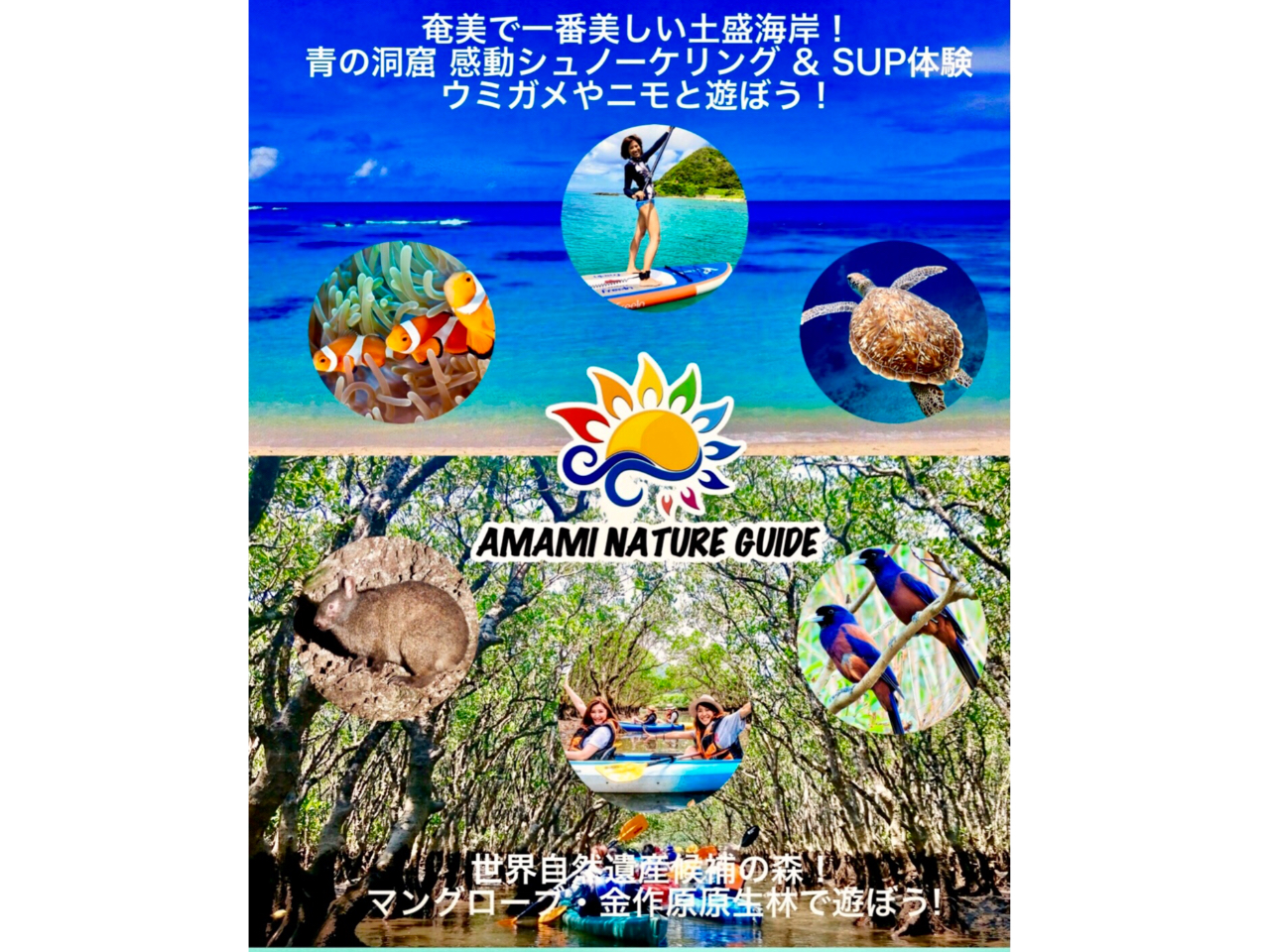 - 奄美自慢の森と海を1日で体験できる欲張りな1日ツアーです ウミガメ遭遇率98% シャワー、更衣室、駐車場完備 カヌーに乗り、マングローブの森を探検いろんな生き物に出会えます。