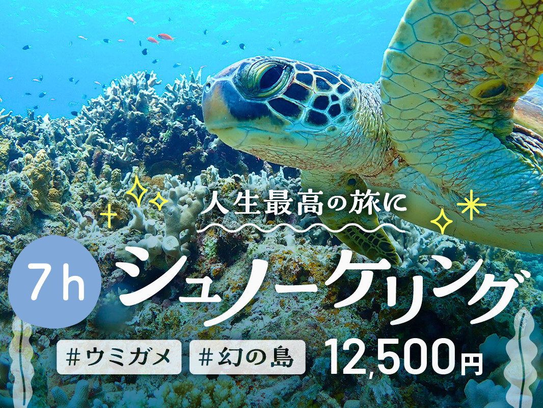 - ◆ウミガメ遭遇率は90%以上!多い日は8匹以上のウミガメと泳げる日も!! ◆絶景!幻の島へ上陸。撮影の無料サービスで思い出の写真をゲット!! ◆泳げない方も大歓迎!インストラクターが完全サポート!!