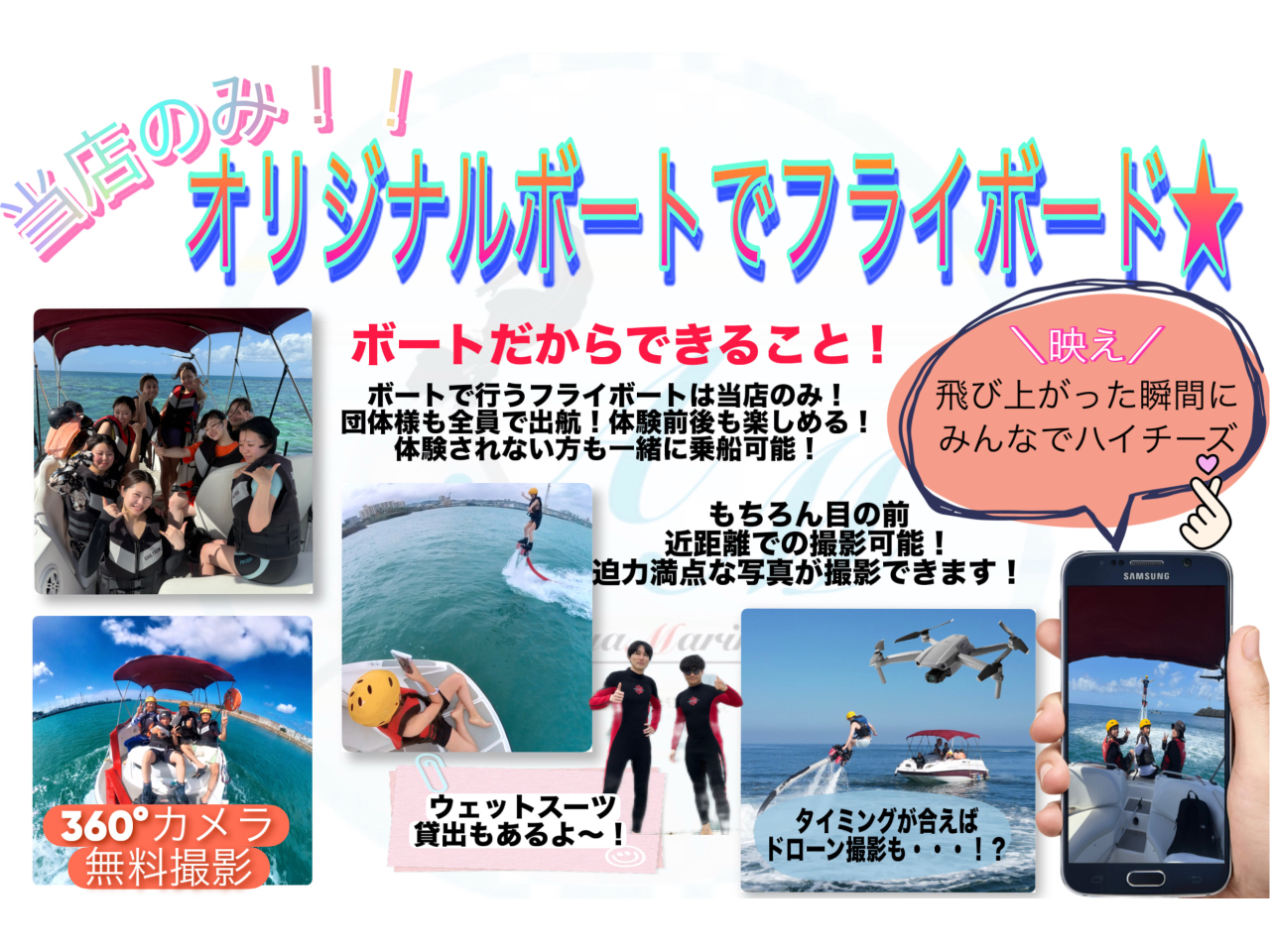 - ・沖縄といえばの海遊び!大人気ジャンルのフライボード体験ができる!! ・オリジナルボートで行うので、待ち時間も撮影自由!乗客全員目の前で鑑賞できます! ・360°カメラの撮影データは無料プレゼント!!