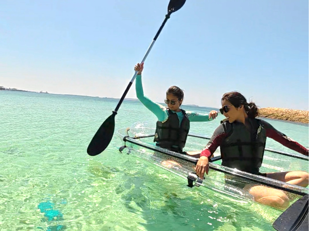 - インストラクターが誘導しオールを使って水面を漕いで進みます。 お子様は3歳から、ご年配の方は健康な方なら誰でも参加OK! 熱帯魚がよく見える、スケルトンタイプのカヤックです。