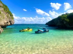 - 旅行者のスキマ時間にピッタリ♪ 泳げなくても大丈夫♪ 島人(しまんちゅ)ガイドが厳選したポイントにいきます! 水上バイク&シュノーケル&洞窟案内の3点セット! シュノーケルなどすべて無料貸出