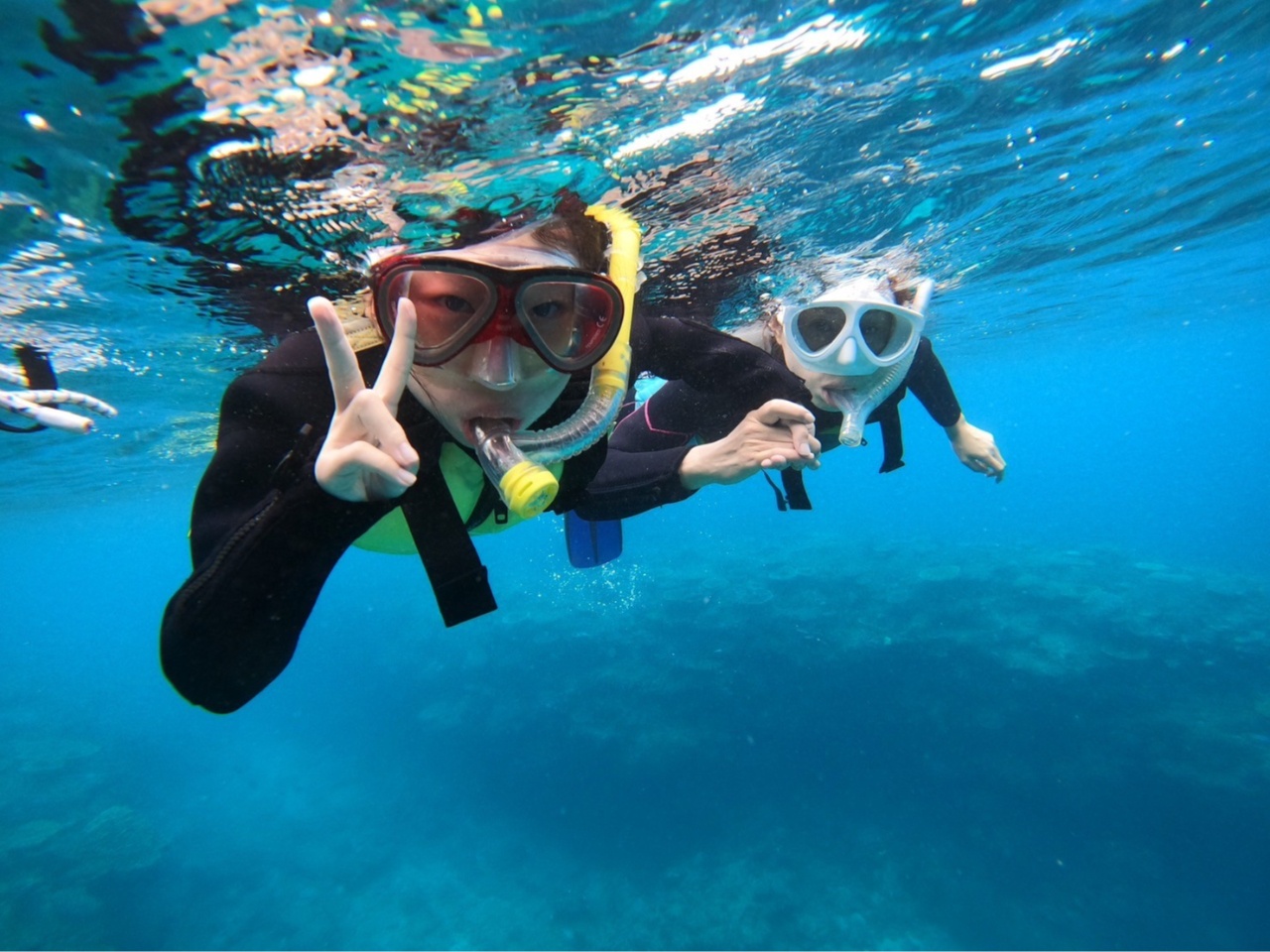 - 息を止め、水中に潜る! 浮力を確保したスノーケリングとも、水中で呼吸ができるダイビングとも一味違った感覚です(^^♪ イルカのように魚たちやサンゴに近づいてみたり、バブルリングを作ってみたりも!