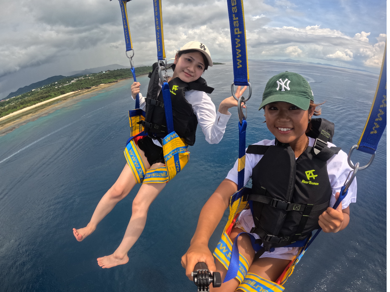 - ★美ら海水族館からお車で約15分の離島「瀬底島」開催 ★ウミガメの住む海でのパラセーリング ★瀬底島、水納島、伊江島の3島を一望! ★上空でのGo Proレンタルサービス