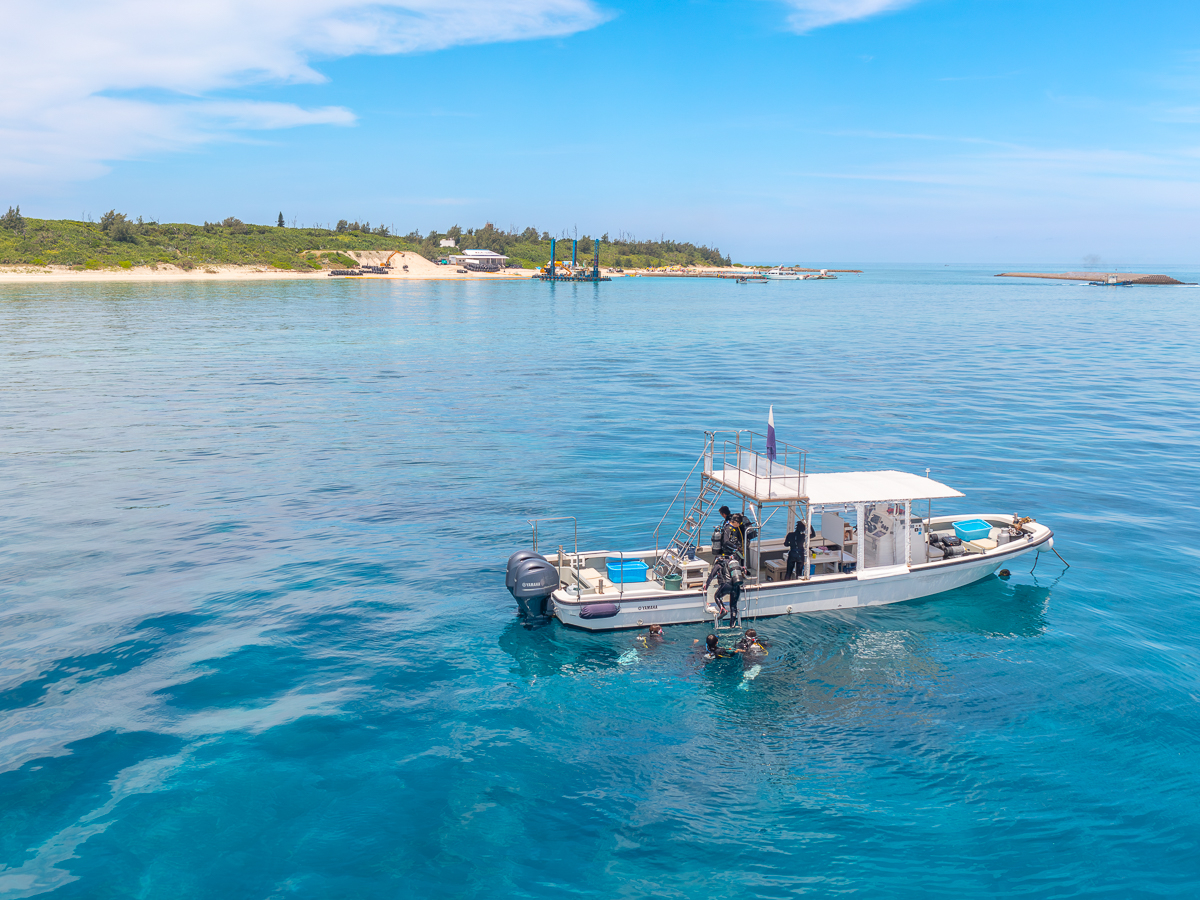 - 1グループ貸切で体験ダイビング! ※船上には他のお客様もいらっしゃいます。 2023年に就航した自社ボートで水納島、瀬底島、本部町近海の中から、その日一番穏やかで潜り易い安全なポイントをチョイスします