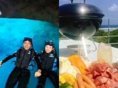 - 青の洞窟シュノーケルツアーの後は、海見え絶景カフェにて、BBQ♪料理長がこだわりのお肉に自信あり!肉厚ボリューム抜群ステーキ肉使用 疲れた身体にご褒美を♪ご希望であれば、ルーフトップでのお食事も可能!