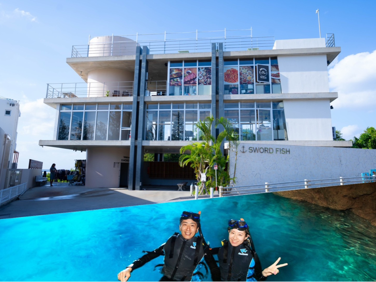 - お店から港までは車で3分。港から青の洞窟までは船で5分!!店舗で講習、シャワー、バスタオル、パウダールーム、3階海見え絶景カフェでウェルカムドリンクを♪全部揃っているのはソードフィッシュだけ!