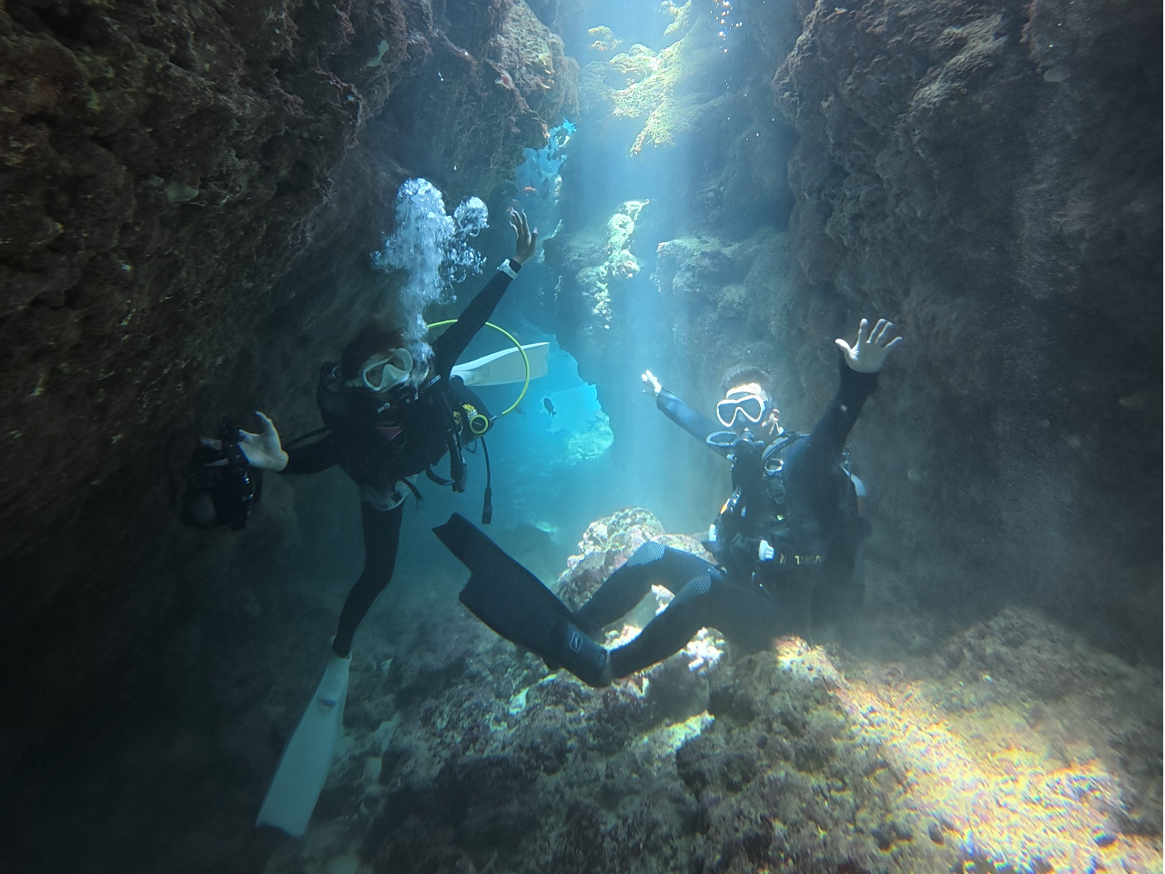 - 浅場から一気に40メートルくらいまで落ちる爽快なドロップオフが楽しめる万座ホーシュー、 ドームやクレバス、アーチ、トンネルなどダイナミックな地形が楽しめる残波岬と豪快さをお楽しみください!
